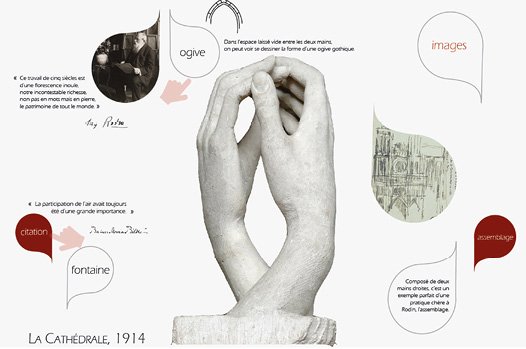 Le monde culturel a vu des changements significatifs dans ses stratégies de communication et de médiation. Nombreuses sont les institutions culturelles qui disposent de sites web, d’applications mobiles, et en leur sein, de technologies de puces RFID ou de Codes QR, en passant par la réalité augmentée ou les tables tactiles. Cet engouement nous questionne sur l’usage de ces technologies, le type de contenu qu’elles supportent, ainsi que sur l’adaptation de ce contenu aux nouveaux dispositifs. Comment l’usage des technologies innovantes contribue-t-il à la valorisation des collections muséales ? Quelles techniques et quelles contraintes impliquent-elles ? Dans le cadre d’un partenariat entre le musée Rodin et la chaire ITEN, l’équipe étudiante a été amenée à imaginer son propre dispositif novateur pour l’hôtel Biron. Après une veille et un travail de recherches et d’archives sur Auguste Rodin, l’équipe étudiante a pris position sur les œuvres à valoriser. Leur projet témoigne d’une réelle volonté d’interagir avec le visiteur et de lui faire partager les gestes liés à la pratique de la sculpture. La charte graphique a été conçue en accord avec celle du musée Rodin.